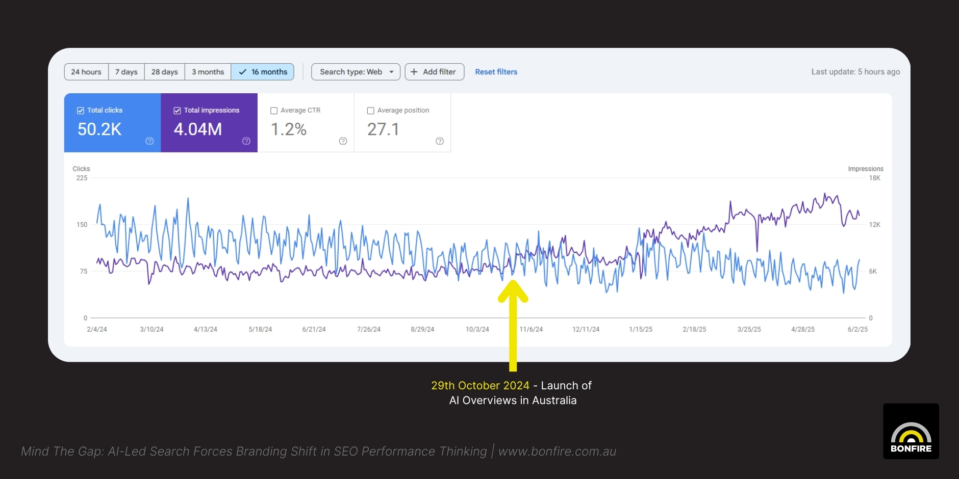Data from one of our clients showing the decline of Google Search clicks as impressions rise, post AI-Overviews launching in Australia.
